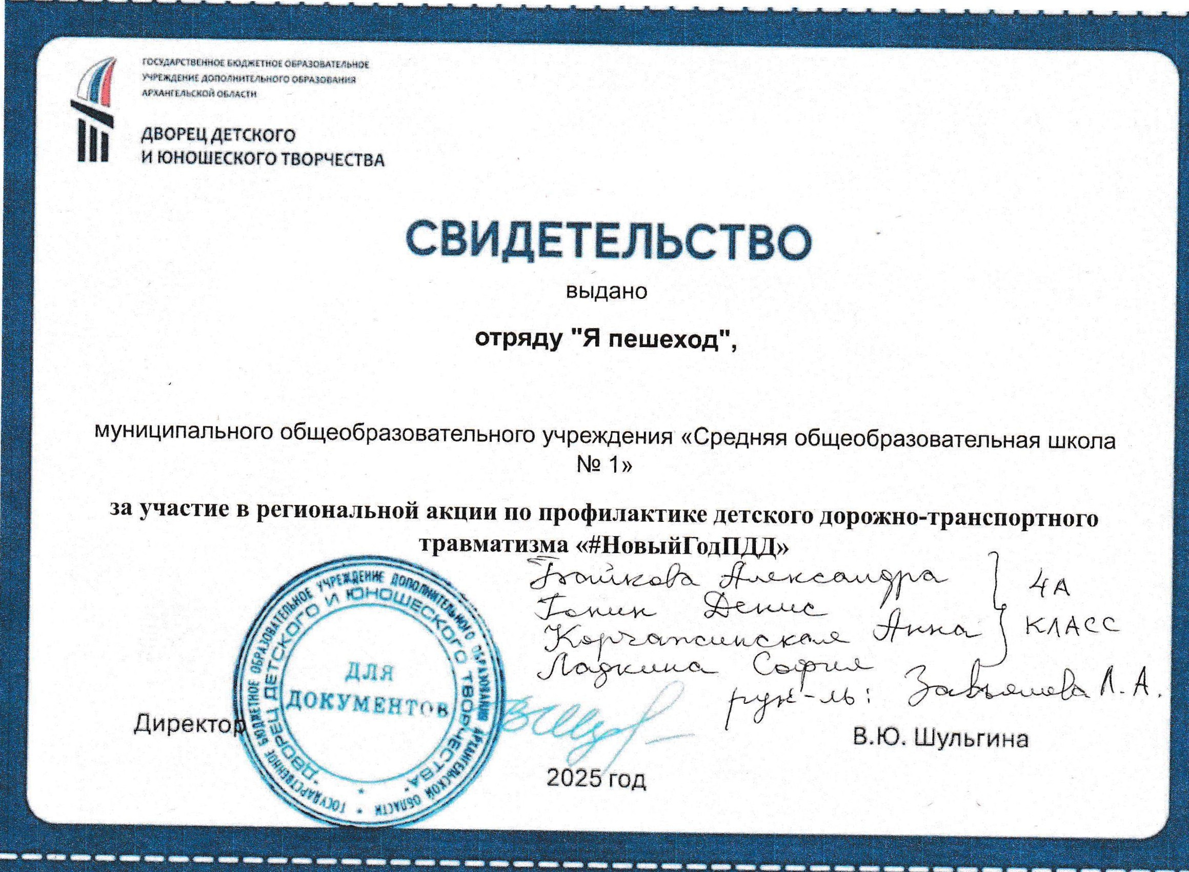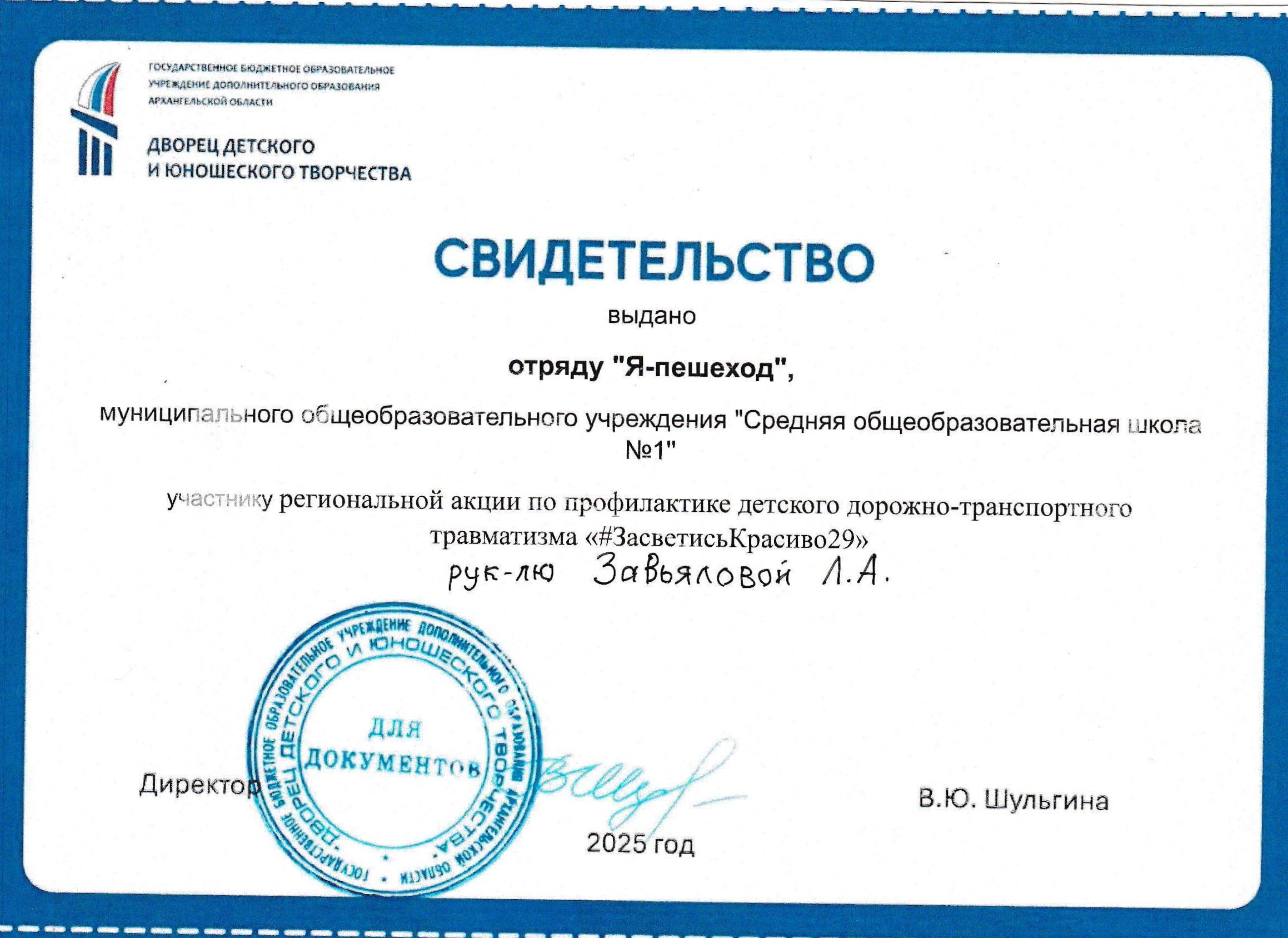Участие в региональной акции по профилактике детского дорожно-транспортного травматизма “#ЗасветисьКрасиво29” (свидетельство)