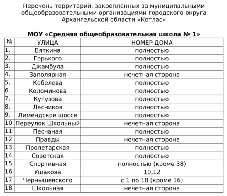Территория микрорайона Лименда, закрепленная за МОУ "Средняя общеобразовтельная школа № 1" согласно Постановления администрации ГО АО "Котлас" от 04.03.2026 г. № 485:
